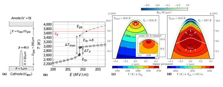 La poursuite de ces travaux (Thèse de D. Mofakhami [3], 2018-2021) a notamment permis – en raffinant l’évolution temporelle de l’auto-échauffement des émetteurs – de différencier l’évolution stable vers un régime permanent et le développement, sous certaines conditions, d’une instabilité thermique causée par la boucle de rétroaction positive entre chauffage résistif et courant émis. Par ailleurs, une certaine gamme de paramètres a été identifiée pour laquelle la compétition entre chauffage résistif et effet Nottingham devenu refroidissant (à haute température) mène à l’observation d’une bi-stabilité autour d’un champ seuil. Cette bi-stabilité est associée à un saut en température comme le montre la figure 1).