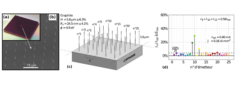 régulier de nano-cônes de carbone. (a) : Puce d’1cm×1cm gravé sur 1mm×1mm. (b) : Micrographie au MEB des nano-cônes de carbone sur la surface gravé. (c) : Schéma de la situation simulée (25 émetteurs issus d’un tirage gaussien sur la hauteur H et le rayon au sommet Rs). (d): Contribution au courant total Itot de chacun des 25 émetteurs au champ limite Elim juste avant la destruction thermique de l’émetteur n°10. J est la densité de courant macroscopique correspondante.